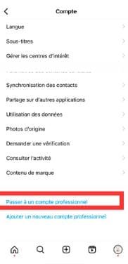 2. Cliquez sur Compte et cliquez sur Passer au compte professionnel.