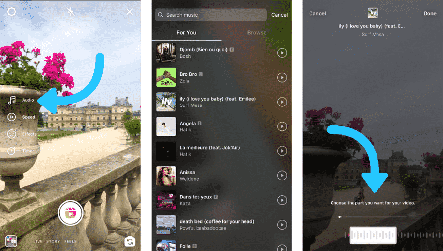 Les utilisateurs peuvent choisir parmi une énorme bibliothèque de musique, emprunter le son d’une autre vidéo ou enregistrer leur propre bande sonore.
